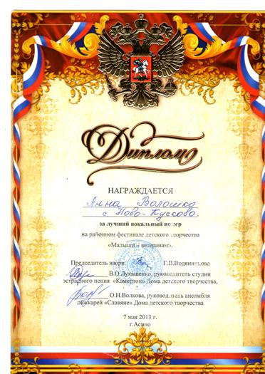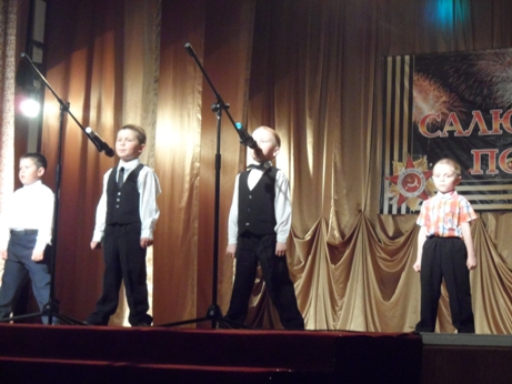 Дети впервые выступали на большой сцене в переполненном зале, но все ребята выступили достойно. Наш детский сад получил грамоту лауреатов, исполнительнице Анне Волошко вручили диплом и памятную статуэтку за лучший вокальный номер, а наш квартет пригласили выступить в с. Ново-Кусково на торжественном митинге, посвященном 68-летию со Дня Победы советского народа в Великой Отечественной войне.