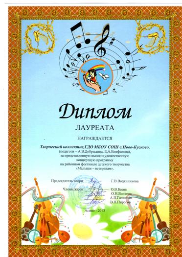Воспитанники Новокусковского детского сада в преддверии Дня Победы 7 мая 2013года приняли участие в районном фестивале детского творчества «Малыши - ветеранам» среди воспитанников детских садов, проходившем в городе Асино в ГДК «Восток».