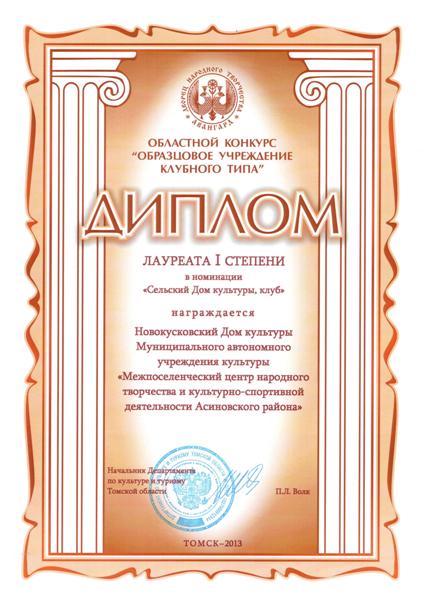 В 2013 году в Томской области проходил I Губернаторский областной фестиваль народного творчества "Вместе мы - Россия!". В рамках фестиваля состоялся смотр-конкурс на звание "Образцовое учреждение культуры клубного типа - 2013", в котором Новокусковский Дом культуры представил свою конкурсную программу "День ангела" и стал лауреатом I степени. Коллективу вручен Диплом и Сертификат на 300 тысяч рублей.