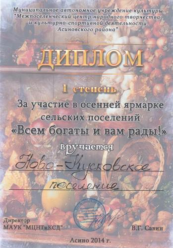 По итогам осенней ярмарки Новокусковскому сельскому поселению был вручен диплом 1 степени и сертификат на 5000 рублей.