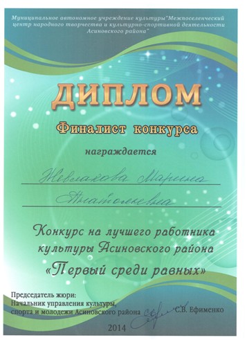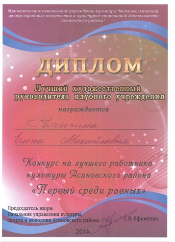 По итогам конкурса в номинации «Лучший художественный руководитель клубного учреждения» победу одержала Пангина Елена Михайловна, художественный руководитель Новокусковского Дома культуры. Ей были вручены грамота от Управления культуры, спорта и молодежной политики Администрации Асиновского района, диплом победителя и сертификат на 15000 рублей.