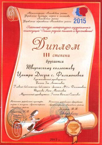 Диплом 3 степени вручён творческому коллективу Центра Досуга с. Филимоновка: художественный руководитель Бычина З.А., главный библиотекарь библиотеки-филиала №5 Тарасова Н.М.,